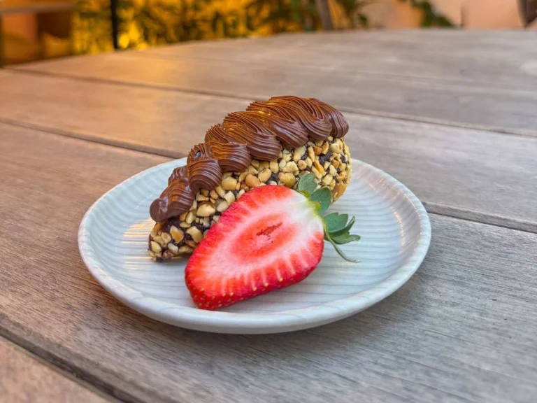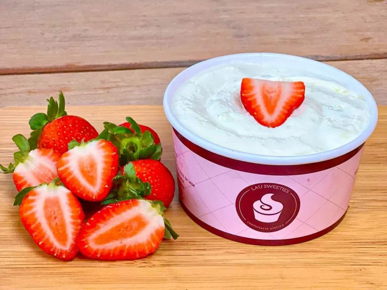 Creme de Ninho, mousse de Ninho, geleia de morango e gotas de chocolate branco.